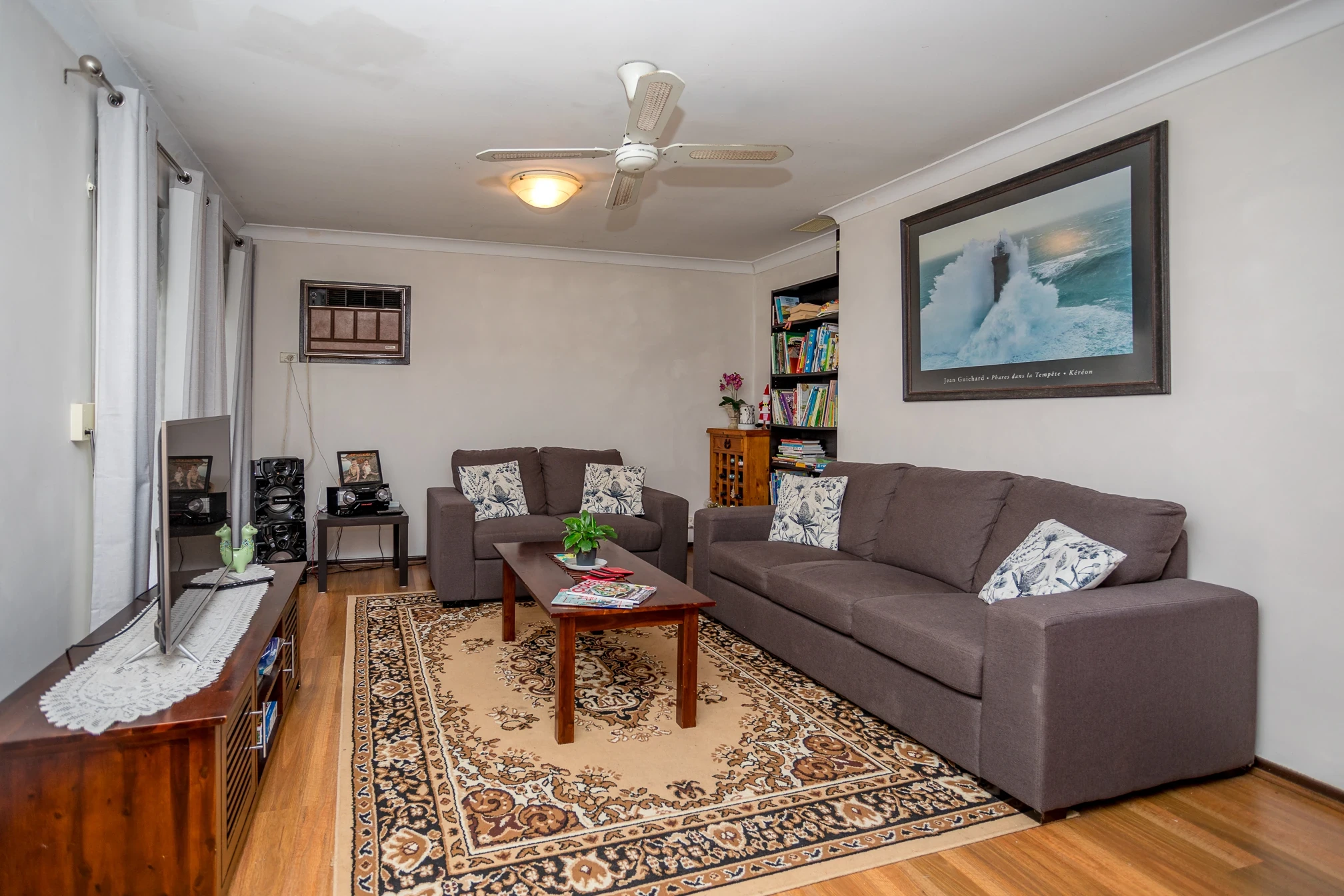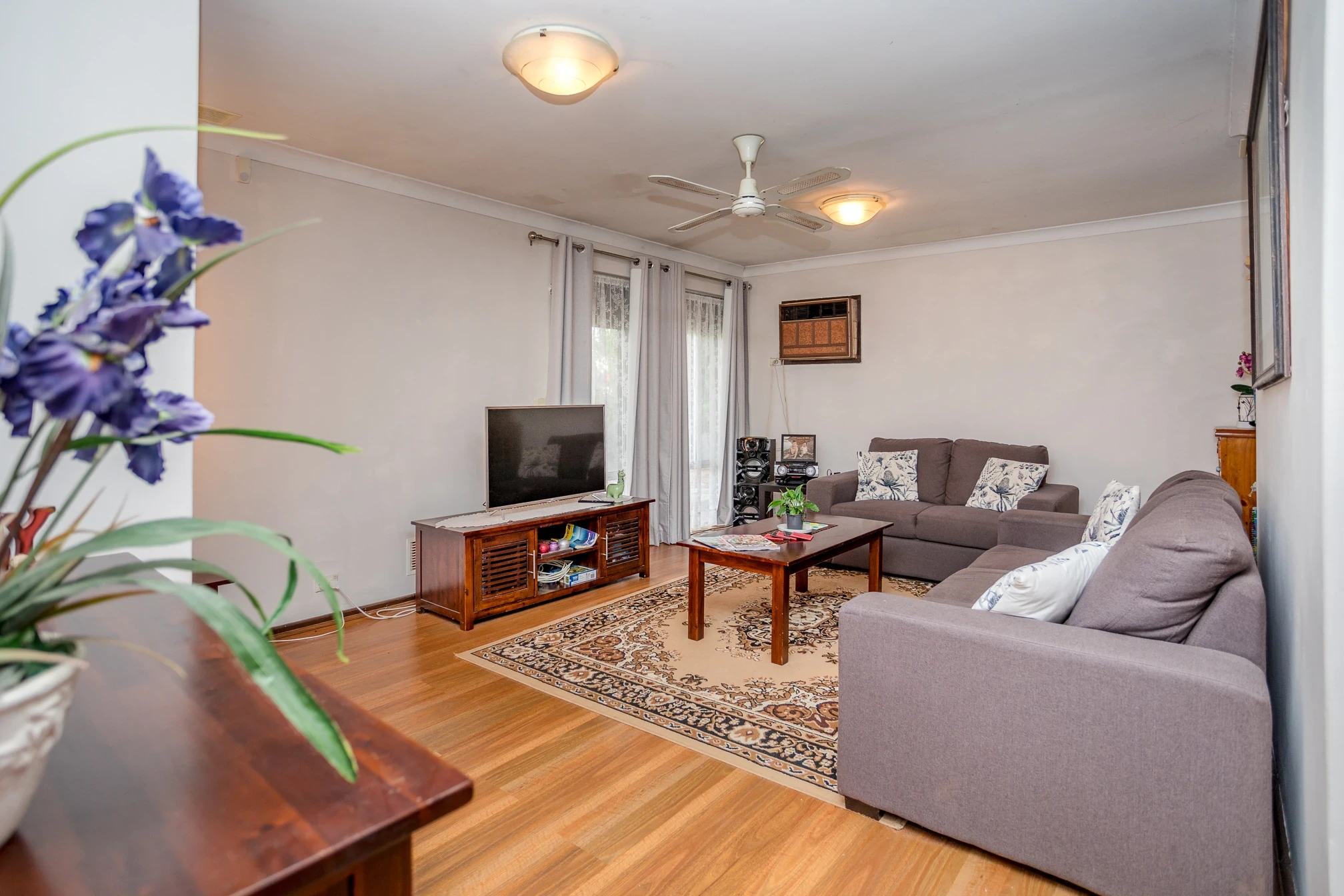 Front lounge with air con wall unit and gas point