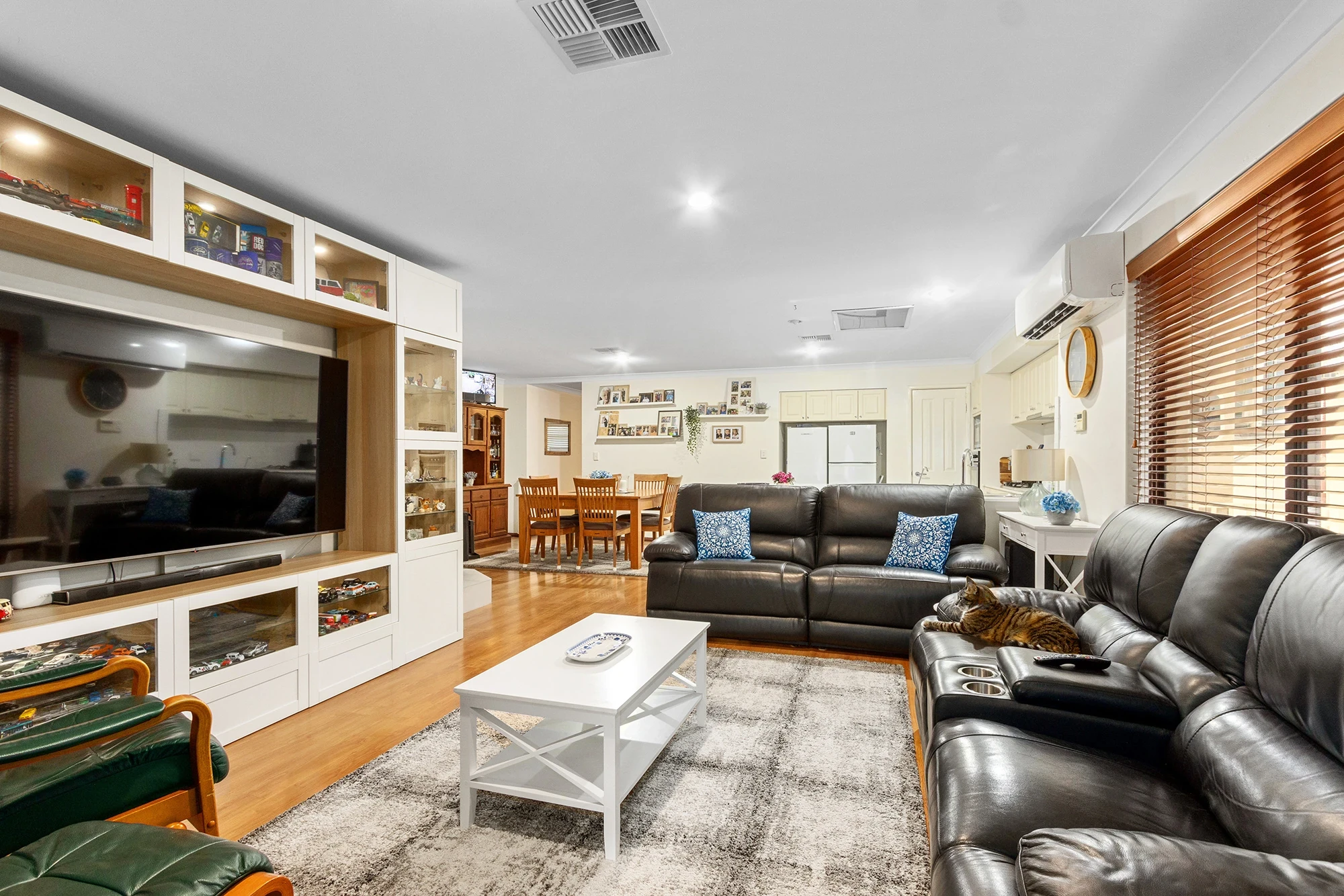 Spacious open plan living & dining with wood fireplace