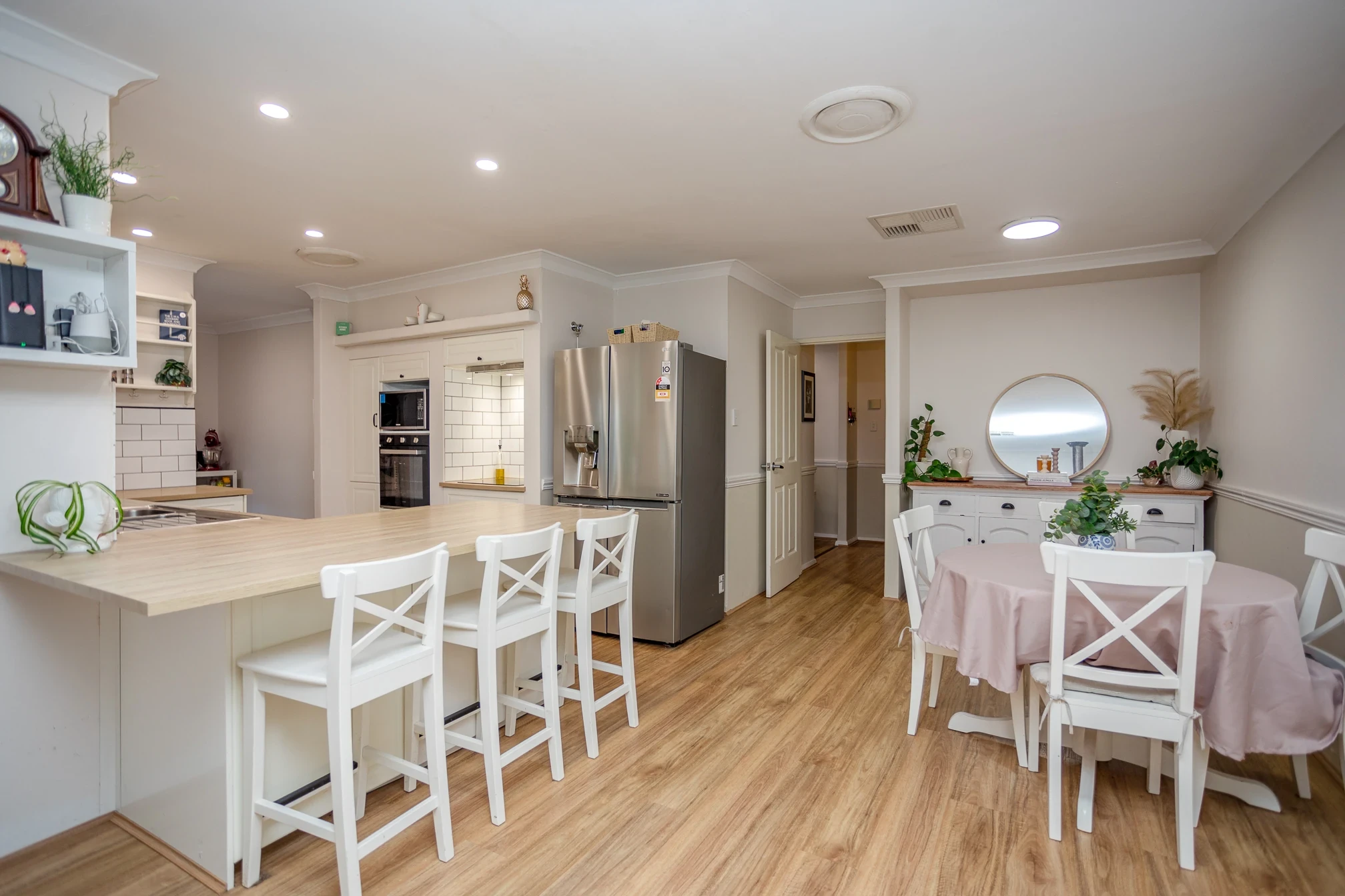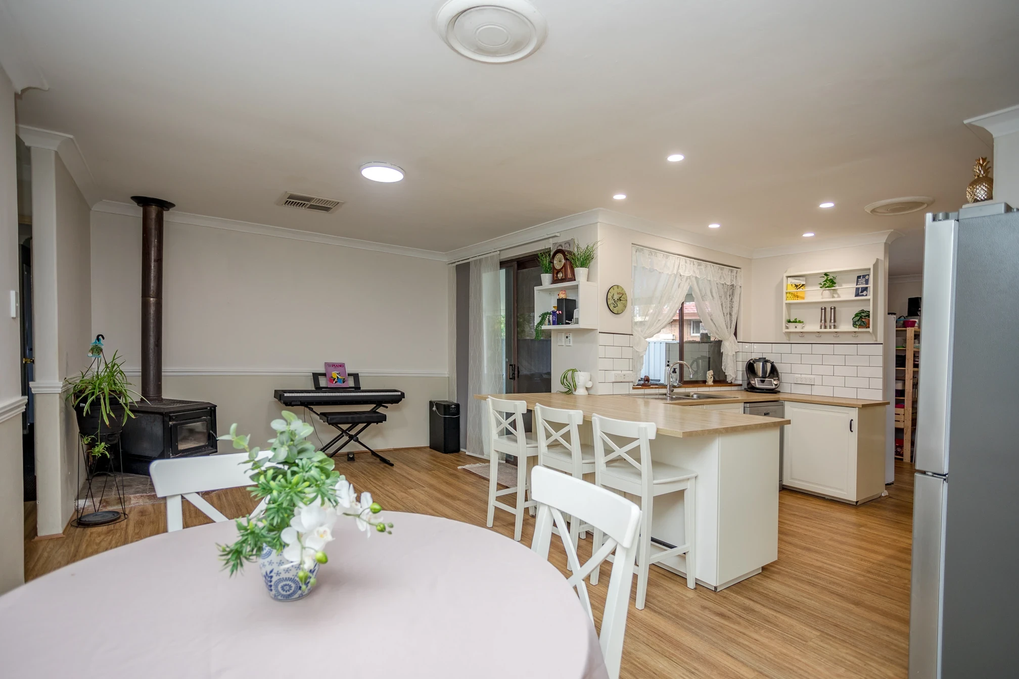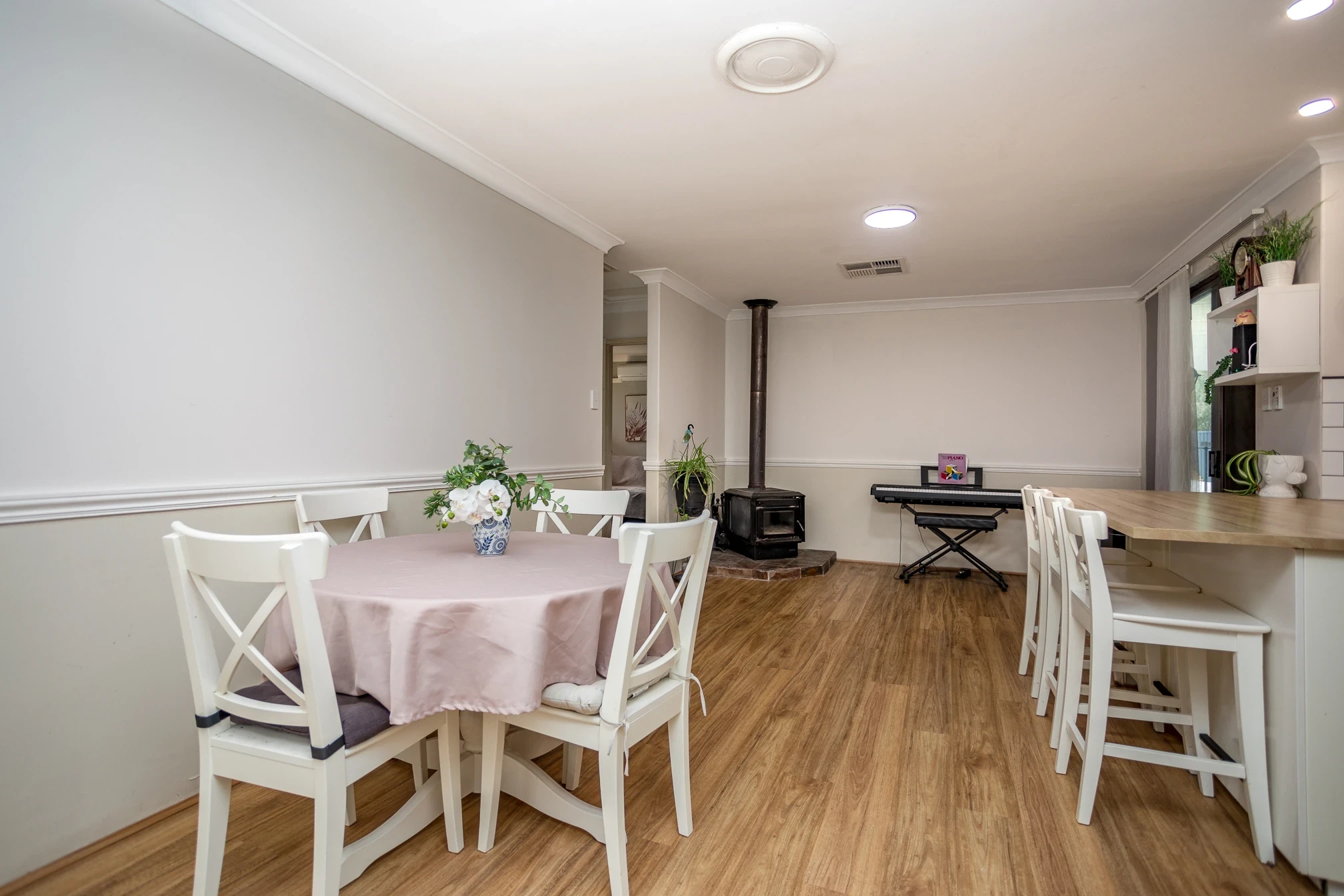 Open plan living and dining with wood fireplace