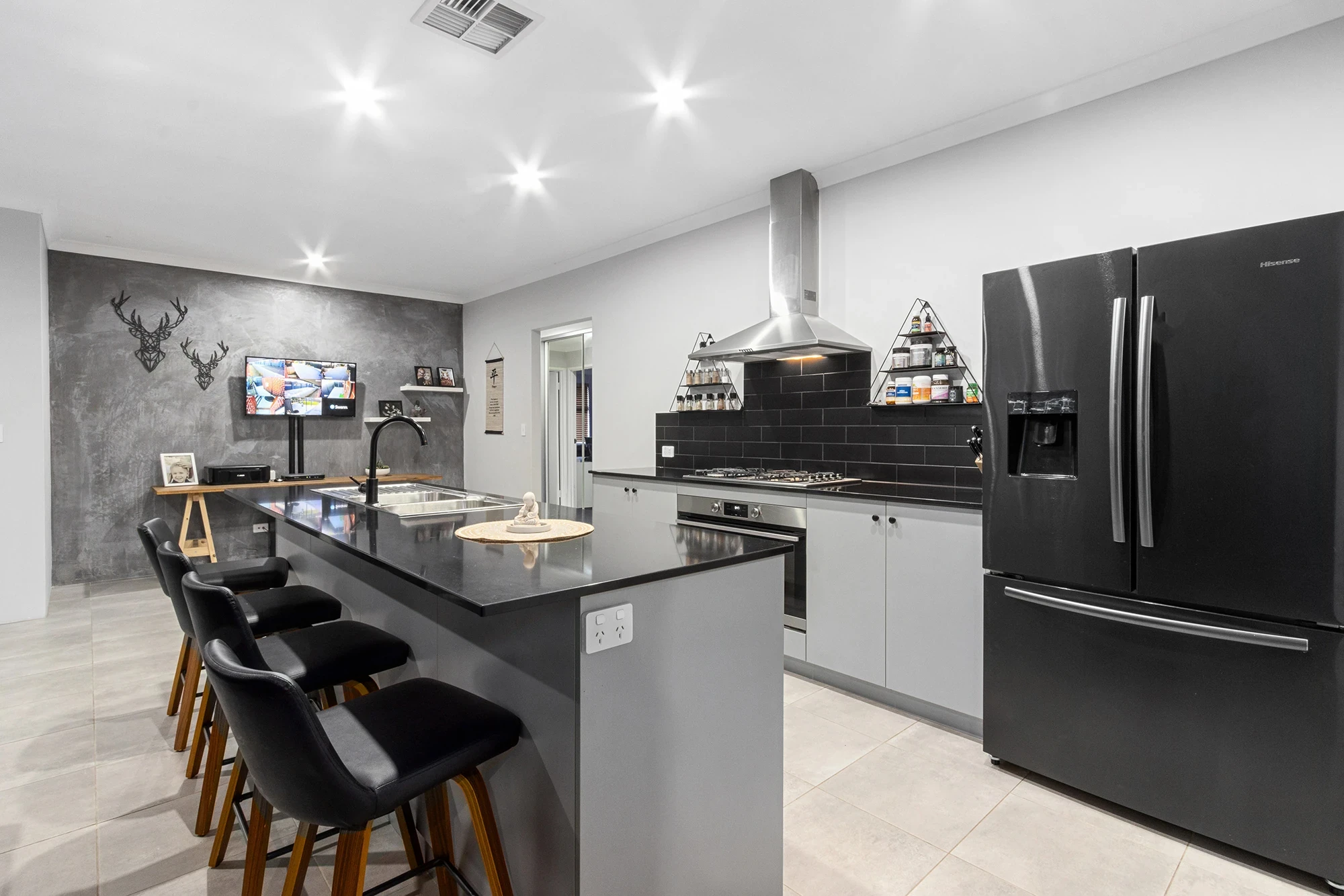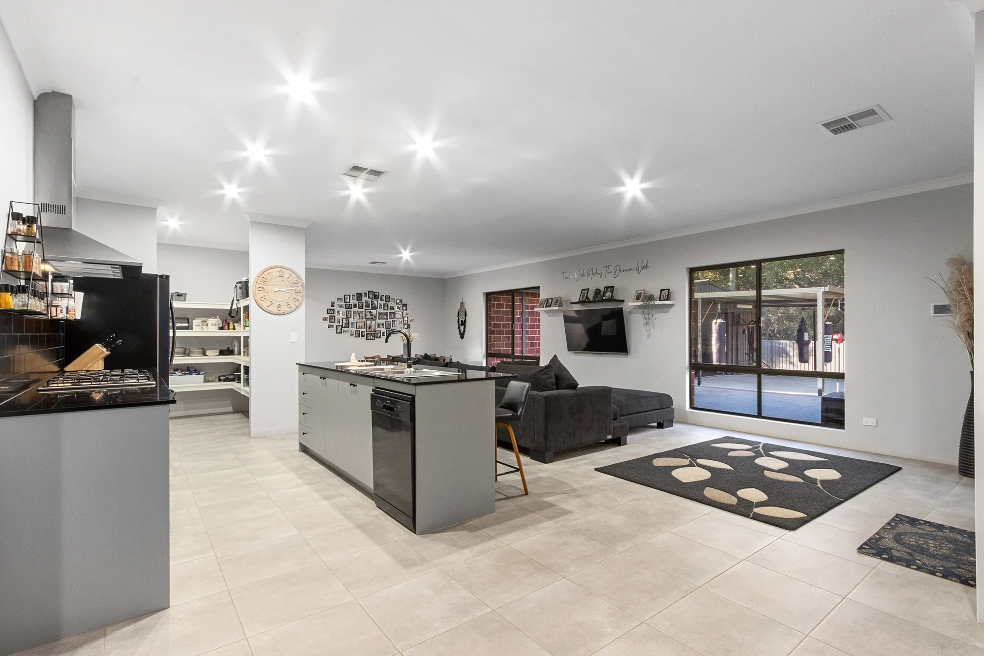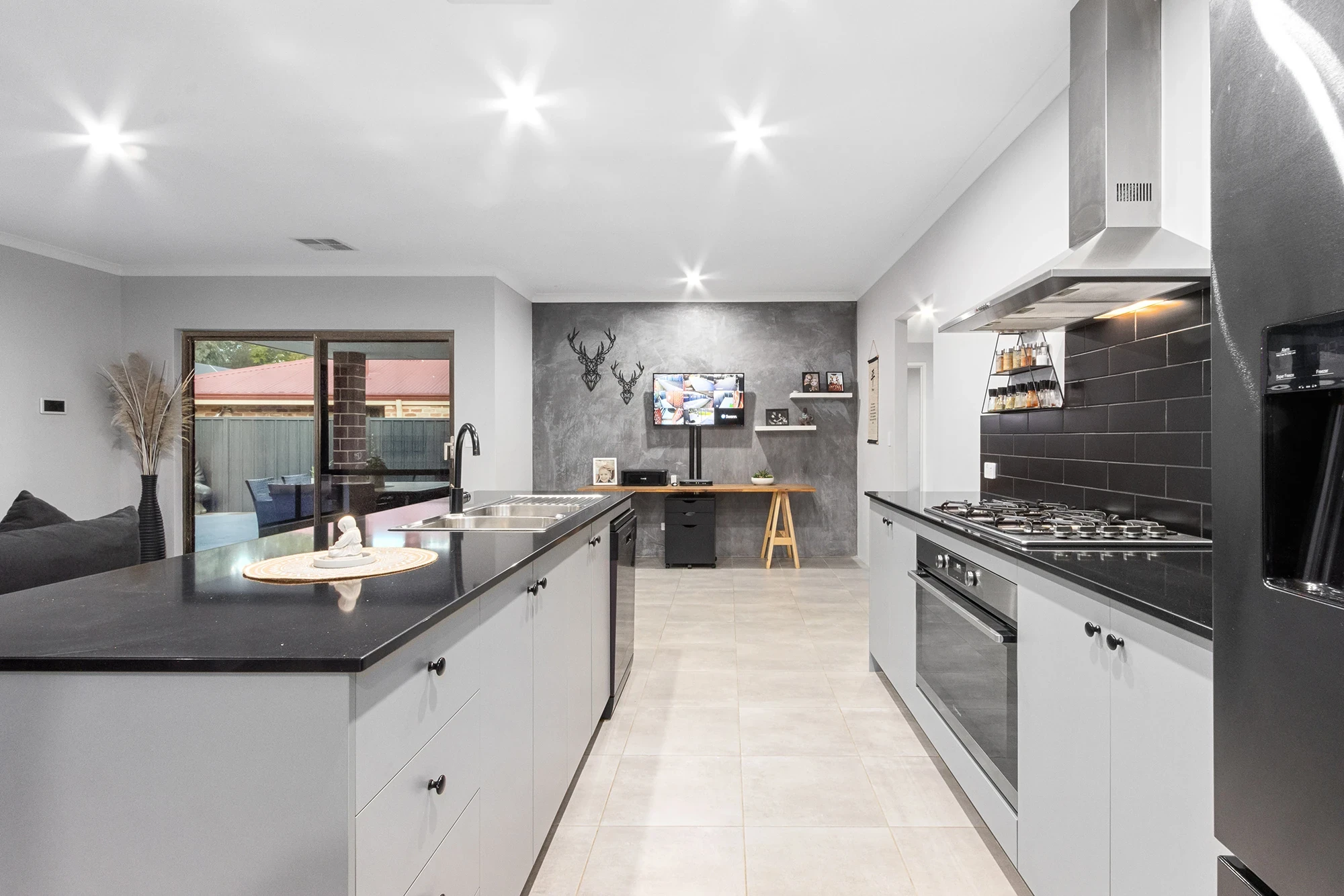 Gallery kitchen with dishwasher, fridge tap and impressive walk in pantry