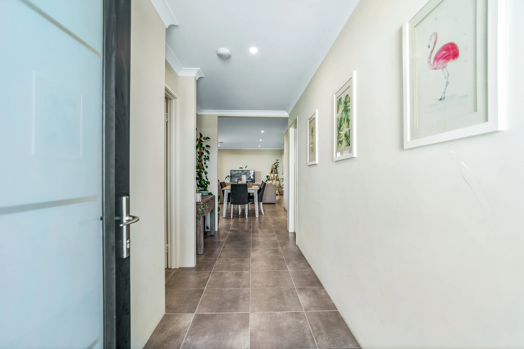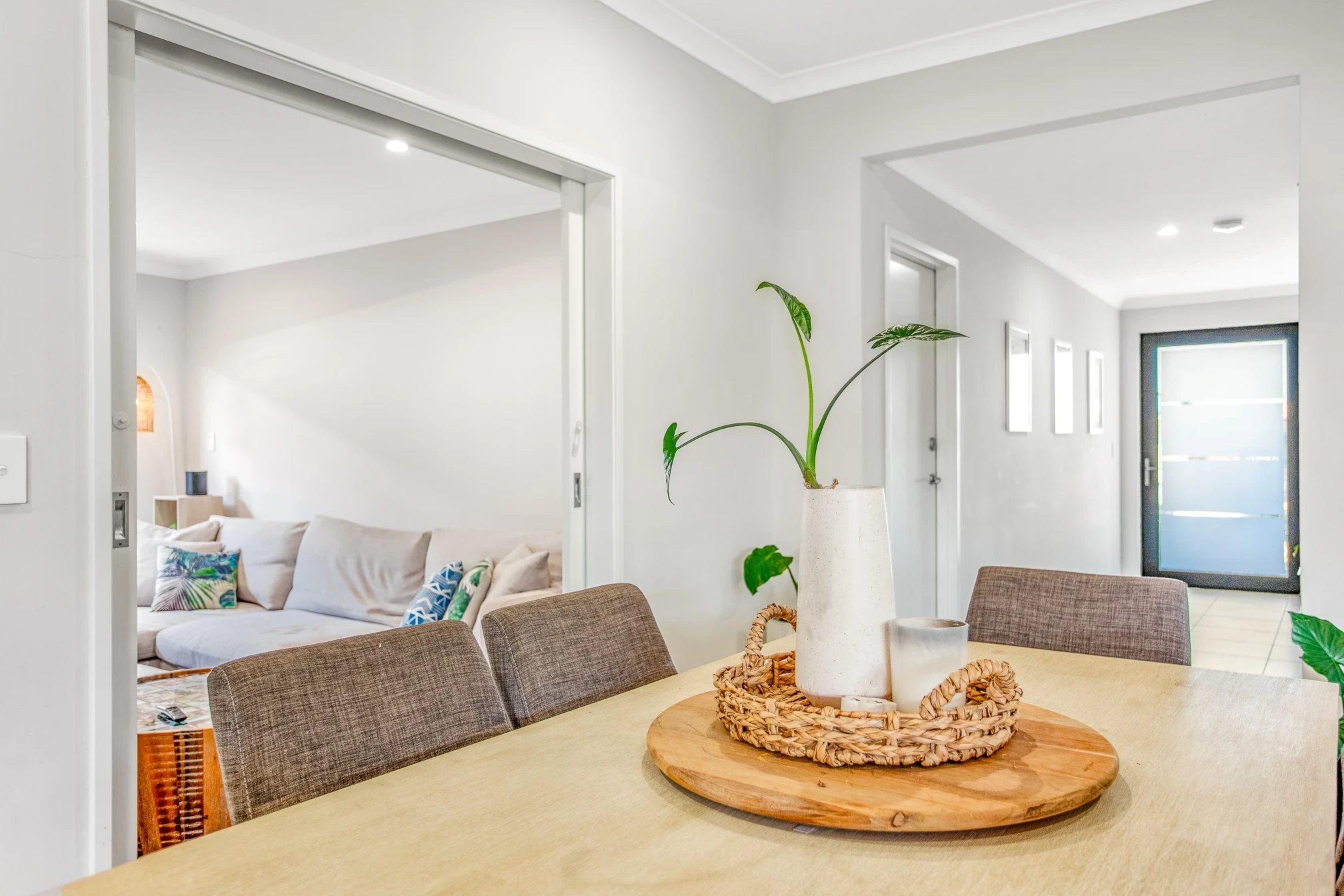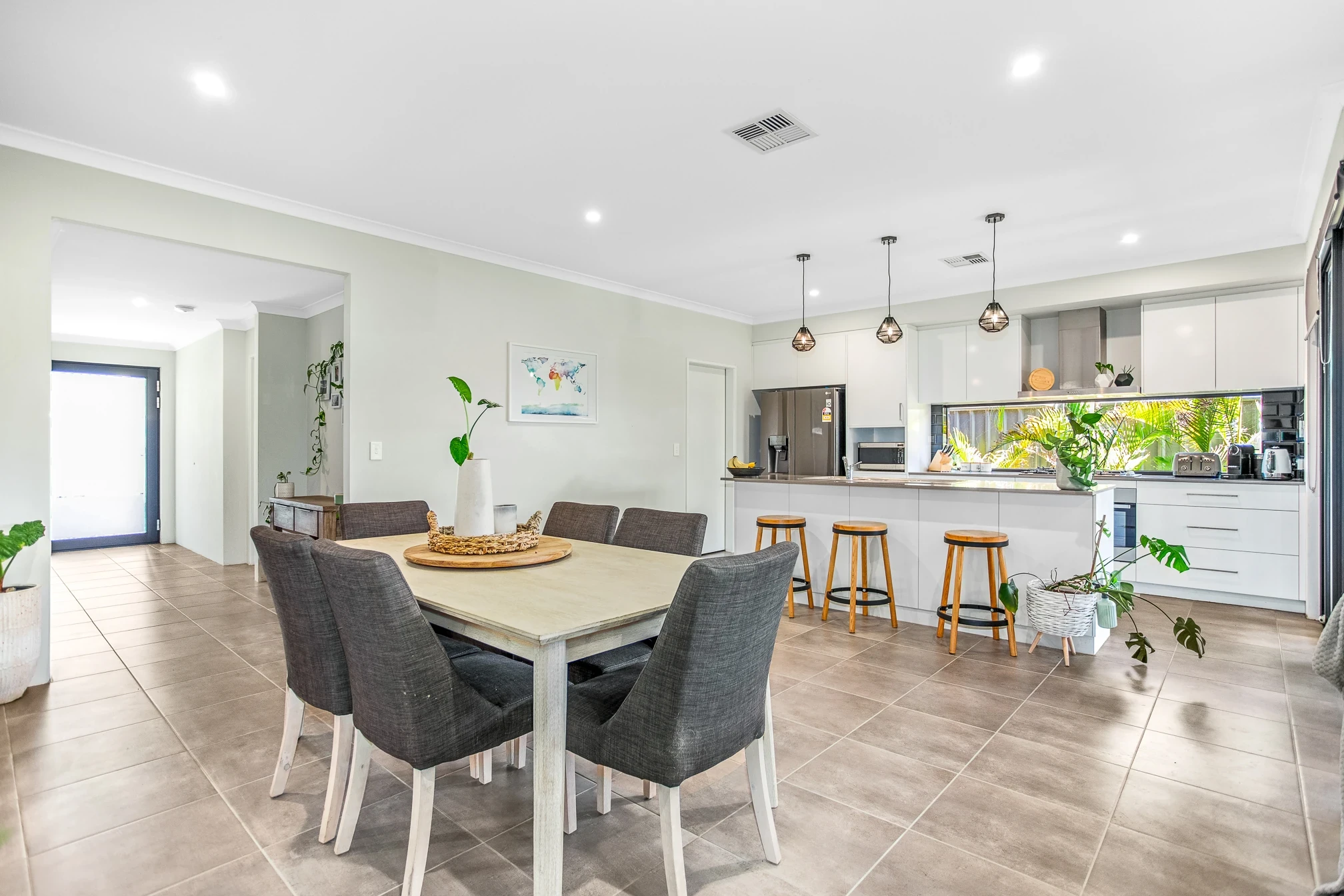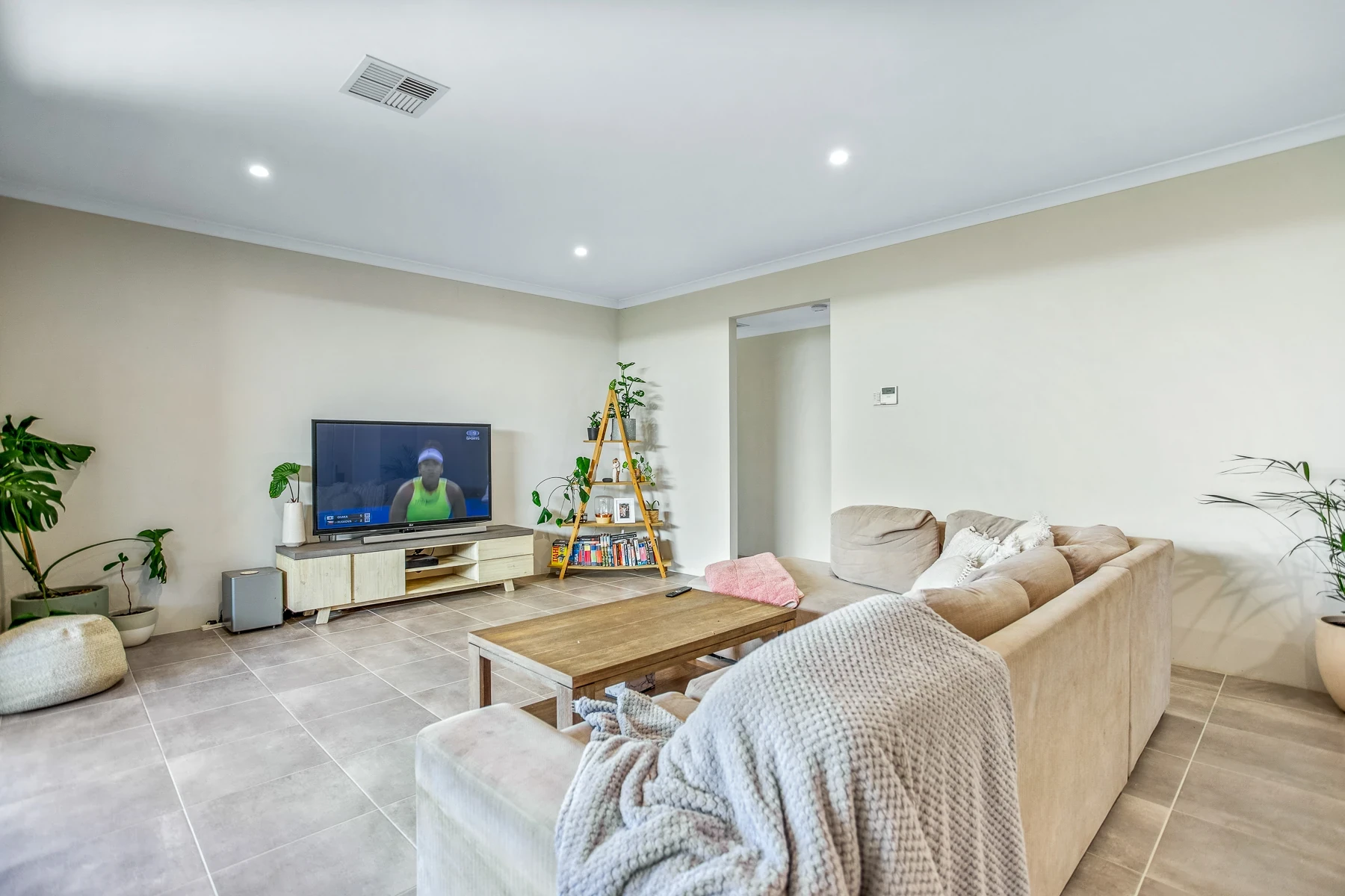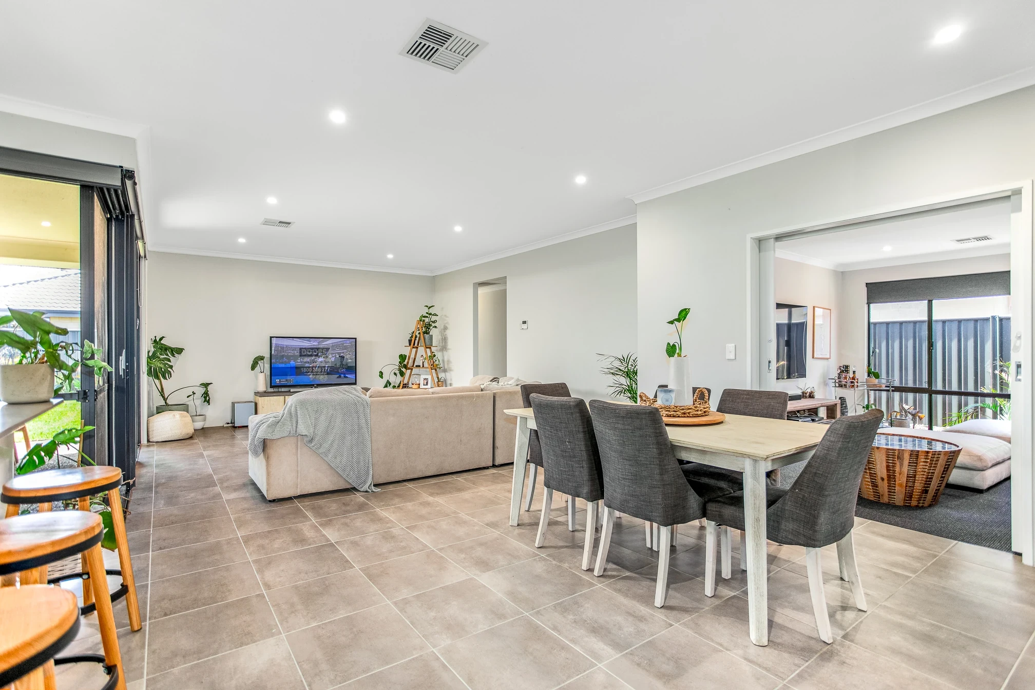 Spacious open plan living with high ceiling and down lights