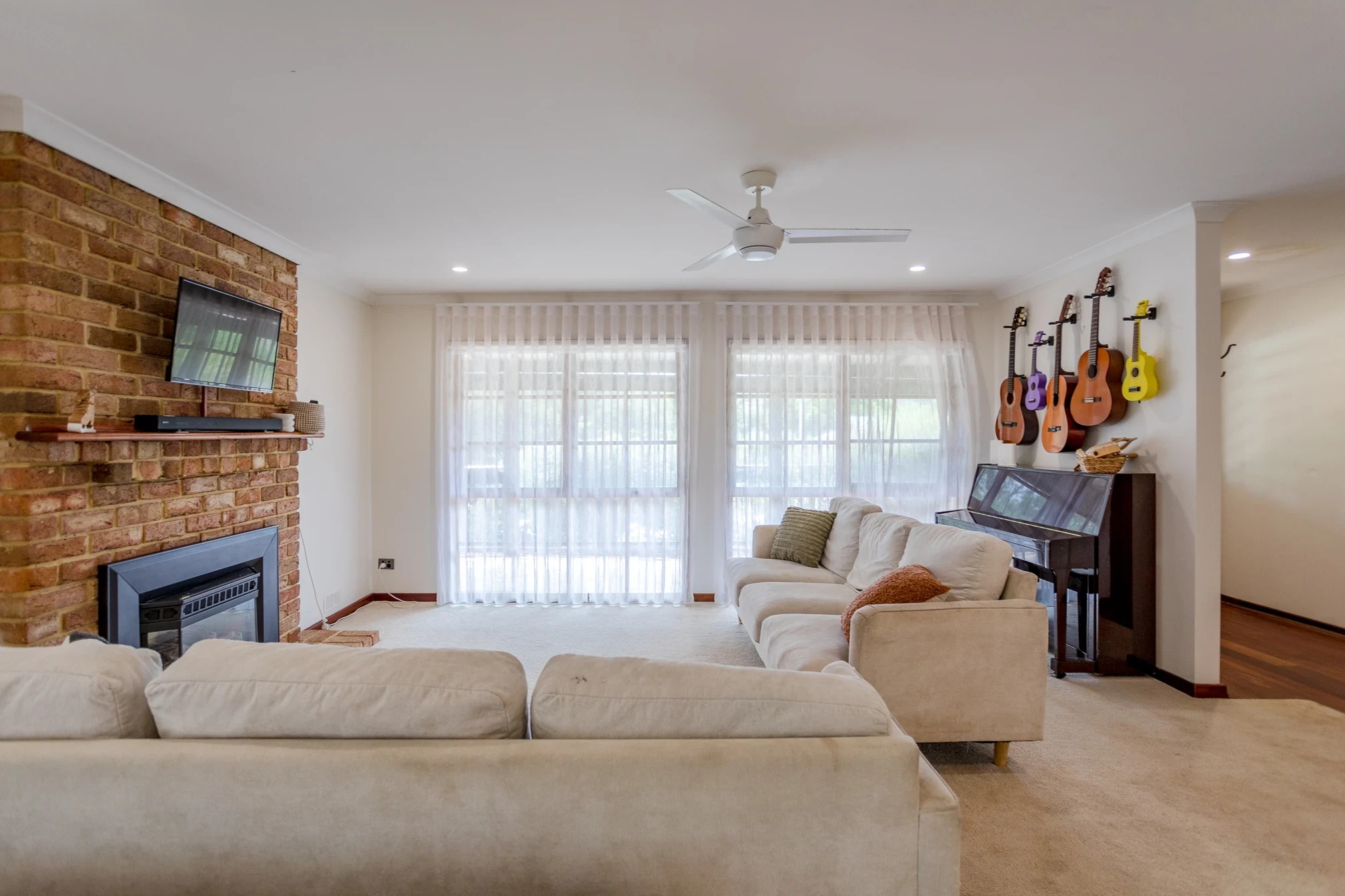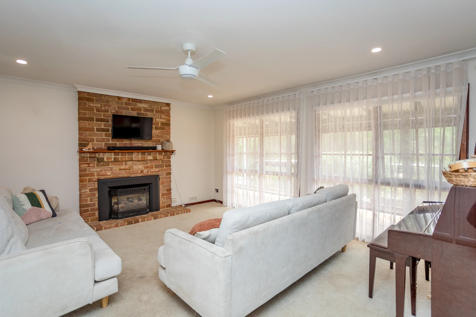 Open plan living & games room with gas fireplace